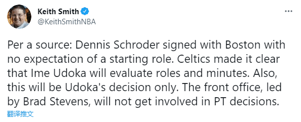 名记Keith Smith曝光更多签约细节,施罗德签约时并没有得到首发保证,凯尔特人明确表示,施罗德的角色和上场时间都由主教练乌度卡决定。