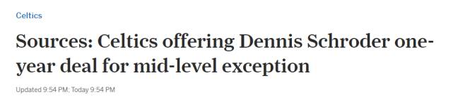 另一位凯尔特人记者Mark Murphy跟进报道称,施罗德只有兴趣签一年,然后将再次成为自由球员。上周,美媒就报道称凯尔特人对施罗德感兴趣,如今他们终于决定向施罗德报价。至于是否接受这份合同,施罗德还需要点时间考虑,不过他已经没有太多的选择。之前他想要一份上亿的多年合同,但并没有球队为他提供如此离谱的报价。