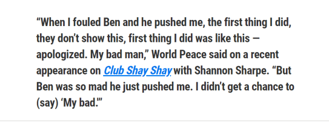 不过,慈世平也承认,错过那次道歉机会的他,最终也没有真正对本-华莱士表达过歉意。他的那次犯规,彻底激怒了大本,而此后发生的事,大家都知道了。