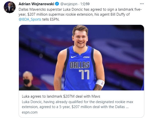 5年2.07亿美元!东契奇新合同细节曝光,回应续约:梦想成真的一天