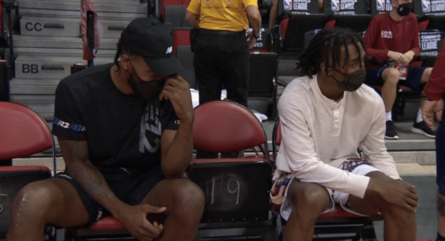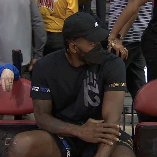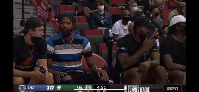 小卡身穿黑色短裤和黑色T恤,并且戴着黑色棒球帽出镜,乔治、肯纳德和快船新星曼恩也来到现场,他们和小卡都是坐在场边看比赛;其中快船双巨并肩坐在一起;快船众将集体观战夏季联赛,为小兄弟们加油打气。