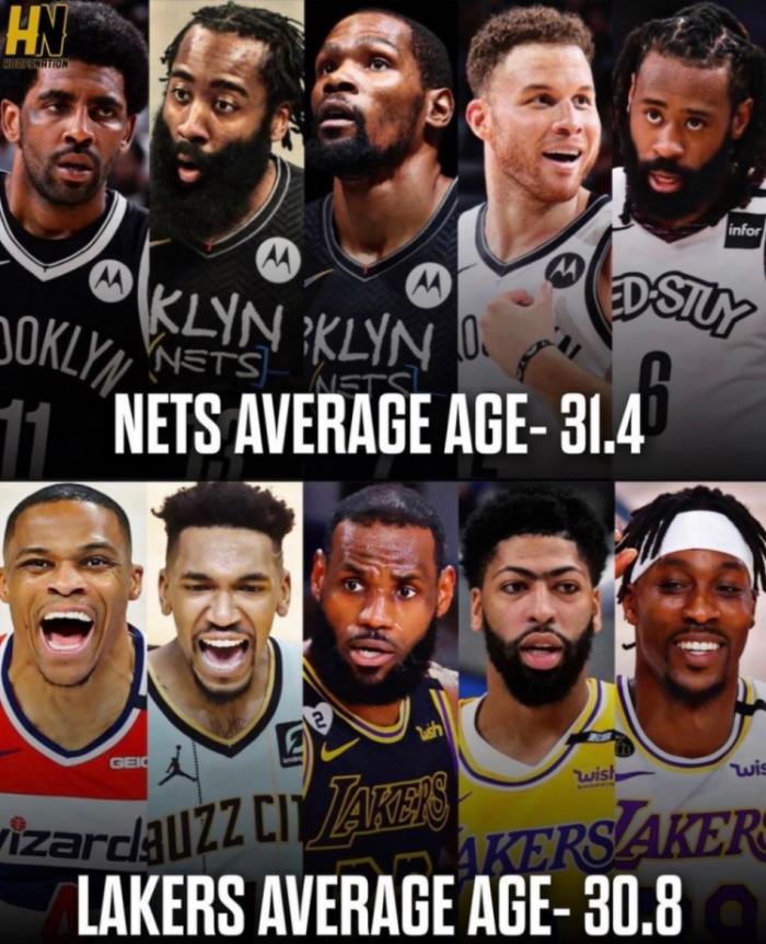 老年队争冠!美媒晒湖人篮网潜在首发5人平均年龄:30.8岁VS31.4岁!