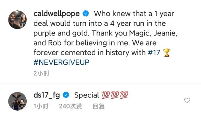 波普在社媒上写道:“谁知道一年的合同,最终会变成四年的紫金时光。谢谢魔术师、珍妮(湖人女老板)、罗勃(佩林卡)一直信任我。第17座总冠军奖杯,让我们被历史永远铭记。#永不放弃。”施罗德在评论区留言写道:“特别!”