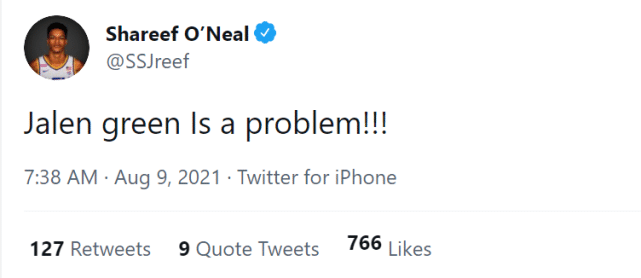 奥尼尔的儿子沙里夫也看了这场比赛,在比赛中他就发推称赞格林会成为联盟的“一个问题”。