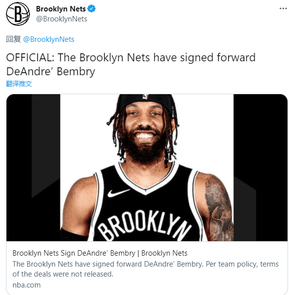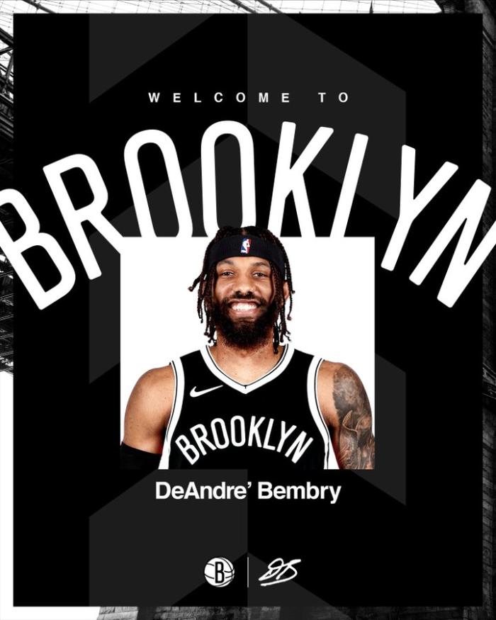 篮网官宣引援前锋德安德烈-本布里签约,晒照欢迎本布里来到布鲁克林;双方签下一年合同;上赛季,27岁的本布里为猛龙效力,场均拿到5.7分2.9篮板2.1助攻。