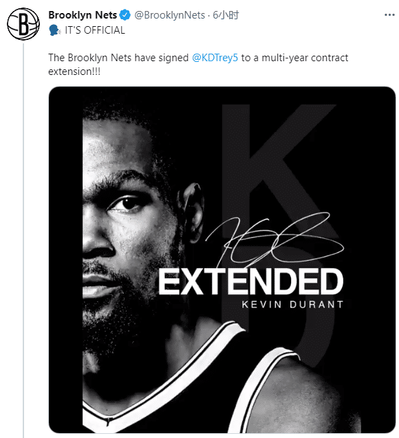 篮网官宣!杜兰特4年1.98亿提前续约,正式续约布朗+欢迎悍将加盟