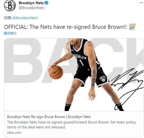 篮网正式续约布鲁斯-布朗,他和篮网签下的是一年470万美元的合同,合同中含有交易否决权;上赛季,布朗为篮网出战65场常规赛,场均可以得到8.8分5.4篮板1.6助攻;季后赛出战12场,其中首发5场,场均7.9分5.1篮板2.1助攻。