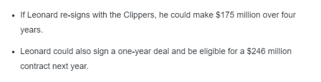 至于第二种方案,则可以让利益最大化,但与此同时有一定的风险。鉴于小卡新赛季的出战可能性不大,就算能回归,也只能打少量的比赛。小卡可以签一份起薪3900万美元的短约,然后在2022年再次成为自由球员,届时,快船将拥有小卡的鸟权,可以和他最多签一份5年2.46亿美元的顶薪合同。