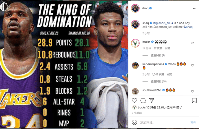 来源:24直播网08-08 10:2424直播网讯 北京时间8月8日,前NBA球星奥尼尔更新社媒,晒出了一张数据对比图。26岁的字母哥场均28.1分11篮板5.9助攻1.2抢断1.2盖帽,已经4次入选全明星,得到1个总冠军戒指和2个常规赛MVP。而26岁的奥尼尔场均28.9分10.8篮板2.4助攻0.8抢断1.9盖帽,那时候已经6次入选全明星,但还没有夺冠和当选MVP。