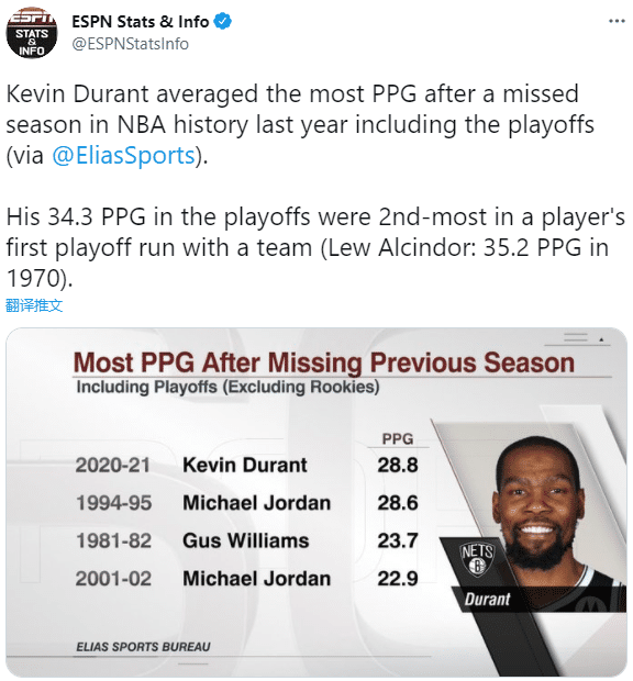 杜兰特是NBA史上缺席一个赛季后重返赛场场均得分最高的球员,常规赛+季后赛场均28.8分,力压94-95赛季的乔丹成为该记录历史第一人。