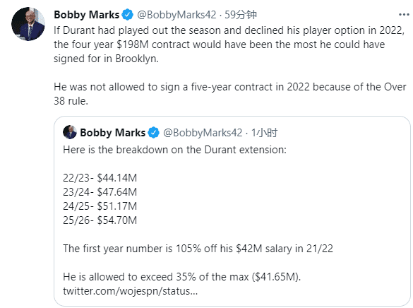 杜兰特之前4年1.64亿美元的大合同还剩下两年合同,而新合同将在2022年开始生效,这意味着杜兰特将会拒绝2022-23赛季的球员选项;由于38岁条款限制,即便是杜兰特在2022年夏天跳出球员选项,他届时也无法签下一份五年合同,因此这是杜兰特能够获得的最大合同了。