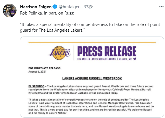 威少正式加盟湖人,佩林卡表示:在洛杉矶湖人队担任控球后卫需要一种特殊的竞争心态;言外之意,威少就是湖人主力控卫,从而彻底释放詹姆斯和浓眉;湖人围绕三巨头打造新的冲冠阵容,安东尼、霍华德以及阿里扎等人都来了。
