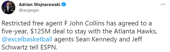 此前老鹰提前续约特雷-杨,为他提供一份5年2.07亿美元的超级顶薪合同,两人都和老鹰签下5年合同,虽然吹杨曾和科林斯有点小矛盾,但两人早已和好如初,未来他俩将继续带领老鹰冲击总冠军。
