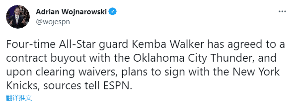 在今年6月的一笔交易中,沃克被凯尔特人交易到了雷霆,但雷霆并不打算留下沃克;如今双方已经达成买断协议,沃克计划在澄清期后签约尼克斯,他将进一步提升尼克斯的后场实力;雷霆正处于重建期,他们希望能把上场时间更多分配给年轻球员。