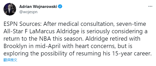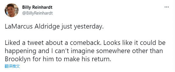 目前阿尔德里奇还并未做出最终的决定,若决定复出,他需通过球队体检后才可签下合同;预计阿德将在未来几周和几支球队会面;对于阿德计划复出,篮网记者Billy Reinhardt发推:若阿德复出,我可以想象的是除了重返篮网,他哪儿都不会去。