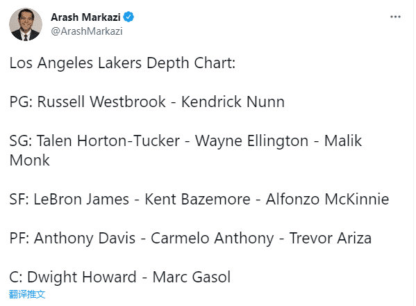 截止到目前,湖人新赛季大名单已有13名球员——控卫威少和纳恩;分卫霍顿-塔克、艾灵顿和蒙克;小前锋詹姆斯、贝兹莫尔和麦金尼;大前锋浓眉、安东尼和阿里扎;中锋霍华德和小加索尔。
