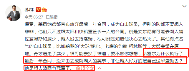 苏群老师主要谈及了三个方面。第一,保罗和莱昂纳德预计离队,其他球队别惦记了;第二,安东尼可能去湖人,洛瑞可能已经下决定加盟热火了,而鲍尔和科林斯等球星,大部分会留队;第三,哈勒尔执行了最后一年合同,成就了湖人的美事,因为他想要去篮网争冠了。哈勒尔至今没有冠军,他想要加盟篮网,就是去争冠,可能在他看来,继续留在湖人争冠没戏了。
