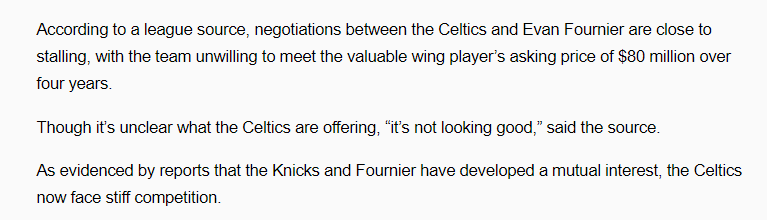 目前富尼耶的5年8500万美元大合同已经到期,今年休赛期他将签下一份新合同,可如今富尼耶想要4年8000万美元,平均年薪2000万美元的合同,凯尔特人并不想给这么大的合同,双方谈判接近失败;与此同时纽约尼克斯有意引援富尼耶,凯尔特人面临被抢人的局面。