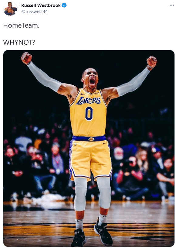 虽然湖人和奇才要等到8月6日才能宣布交易完成,但威少已经提前向奇才告别,并且晒出自己身穿湖人0号球衣照,正式宣布加盟湖人,发推写道:家乡球队,为什么不呢?