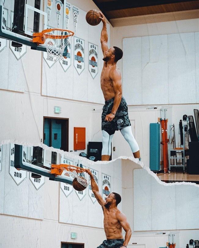 这是库里?摄影师晒单臂劈扣照,赤裸上身肌肉爆棚,球迷:篮筐多高?