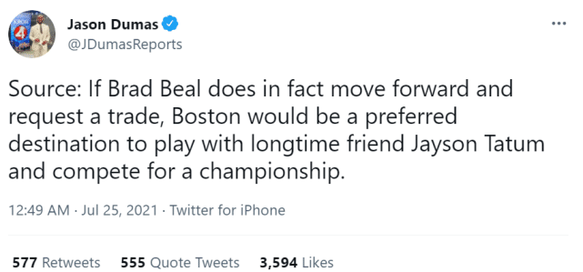 比尔此次因新冠检测阳性无缘奥运会,也错过了和塔图姆一起为美国男篮打球的机会。此前接受采访时,比尔曾表示自己和塔图姆从小都没有在一支球队打过球,这次能共同效力国家队,两人都非常兴奋。遗憾的是,最终这一愿望落空。不过,他俩现在有机会在同一支NBA球队效力了。美媒报道称,如果凯尔特人要通过交易得到比尔,他们最可能送出的筹码是杰伦-布朗。