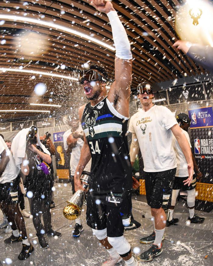 来源:24直播网07-22 19:2324直播网讯 密尔沃基雄鹿4-2击败太阳夺得总冠军之后,字母哥第一个把总冠军奖杯带回家,并且抱着奥布莱恩杯和FMVP奖杯睡觉;总决赛G6字母哥狂砍50分14篮板5盖帽,总决赛场均35+13全票当选FMVP。