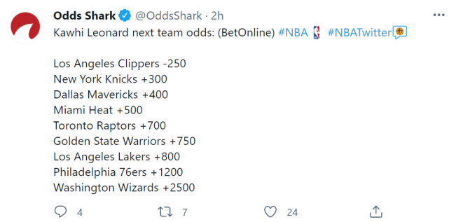 来源:24直播网07-21 11:0924直播网讯 北京时间7月21日,科怀-莱昂纳德已经完成前十字韧带的修复手术,预计要缺席2021-22赛季的大部分时间。此前有报道称,他依然会跳出合同,成为一名自由球员,那么莱昂纳德接下来会和哪支球队签约呢?最新下家赔率已经出炉!