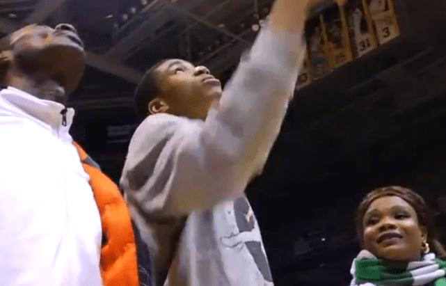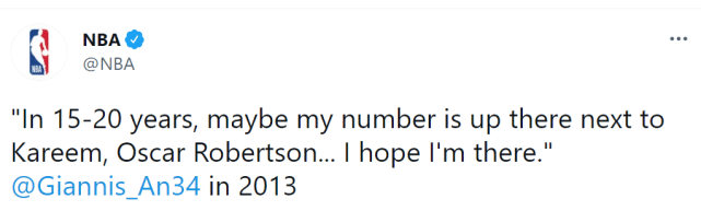 NBA官网也在为总决赛G6预热,他们晒出了2013年的一段老视频。视频中,当时还一脸青涩的字母哥领着父母参观雄鹿球馆。他指着球馆上空贾巴尔和罗伯特森的退役球衣说道:“再过15-20年,可能我的球衣号码也会悬挂在那里,在贾巴尔和罗伯特森的旁边,我希望我能达到那样的高度。”