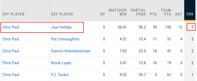 总决赛至今的5场比赛,保罗一共出现了18次失误,而前三轮的14场比赛,他总共只出现22次失误。