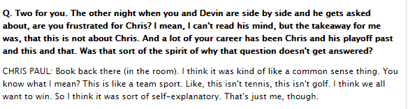 当时保罗就坐在布克的身旁,如今保罗回应此事:布克现在就在后面的房间里。我认为这有点像一个常识性的东西。你知道我的意思吗?这是一项团队运动,不是网球,不是高尔夫球。我认为我们都想赢,所以布克的意思不言自明;当然,这只是我个人的看法。