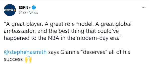 名嘴Chris Broussard在节目中表示:即使从未加入超级球队,字母哥仍可能赢得一个总冠军,詹姆斯没有真正做到这一点,杜兰特也没有做到,这对字母哥的历史地位意义重大。
