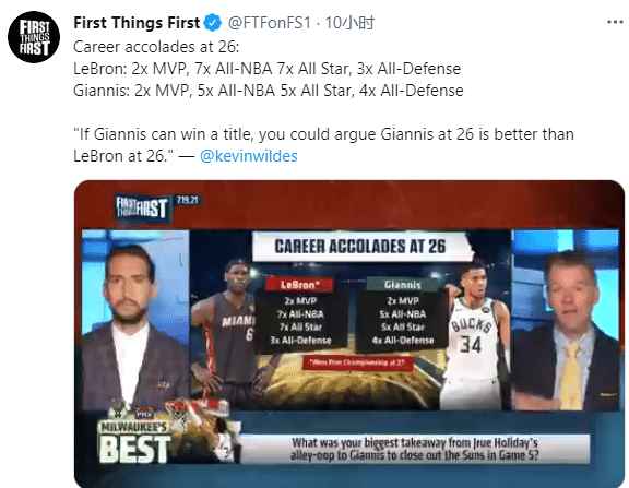 名嘴Kevin Wildes则表示若字母哥今年夺冠,26岁字母哥则强于同时期的詹姆斯;他对比两人在26岁时所获荣誉——詹姆斯2届MVP,7届全明星,7次入选最佳阵容,3次入选最佳防守阵容;字母哥则是2届MVP,5届全明星,5次入选最佳阵容,4次入选最佳防守阵容。