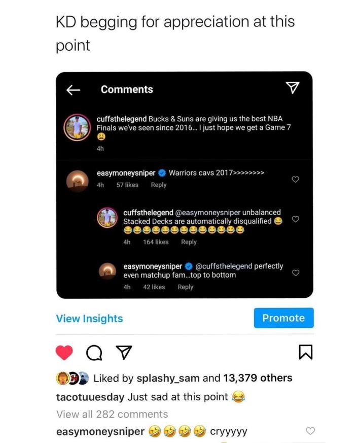 来源:24直播网07-19 18:2024直播网讯 最近杜兰特在互联网上可是非常的忙,前有和网友在语音聊天室中争论,最近杜兰特又和网友在互联网上进行关于总决赛的互动。此前一位网友在互联网上说:今年的NBA总决赛是2016年之后最精彩的总决赛,希望能够打到7场比赛。而杜兰特则在这位网友下面评论道:2017年勇士VS骑士远大于今年。然后该网友回复到:实力悬殊的总决赛应该被自动排除。而杜兰特马上回复到:完全势均力敌的较量,老哥……从上到下都是如此。
