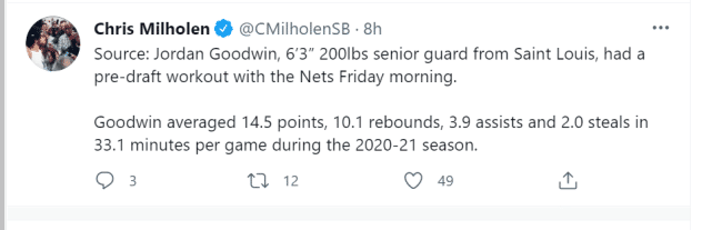 NBA记者Chris Milholen报道称,篮网在当地时间上周五试训了圣路易斯的大四后卫乔丹-古德温。身高1米90的古德温很擅长抢篮板,大四赛季场均贡献14.5分10.1篮板你3.9助攻,投篮命中率43%,三分命中率31.4%,罚球命中率64.3%。在NCAA赛场上,一个得分篮板场均两双的后卫,还是比较罕见的。古德温预测能在第二轮被NBA球队选中。