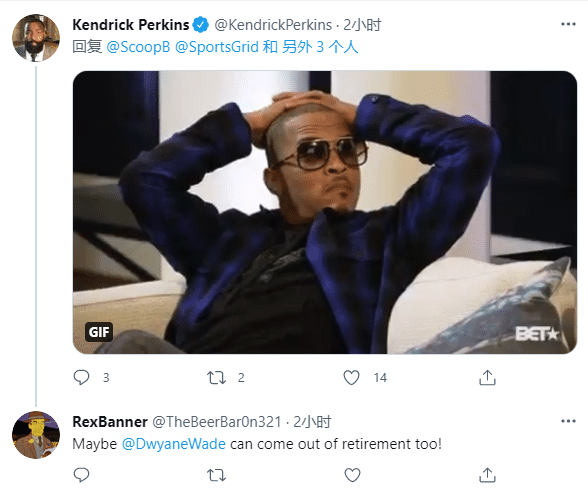 对于这样的观点,名嘴帕金斯在评论区晒出一个表示赞同的表情包,美球迷RexBanner回应:也许韦德也该从退役中复出。