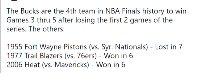 数据显示,在NBA总决赛历史上,输掉前两场后连胜三场的球队至今一共有四支,前三支是1955年的活塞,1977年的开拓者和2006年的热火。活塞最终抢七失利,开拓者和热火都是4-2夺冠。雄鹿将要面对的是怎样的结局?双方的第六战将在北京时间7月21日上午9点打响。