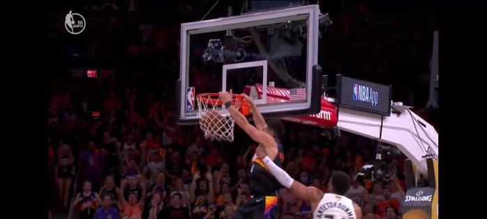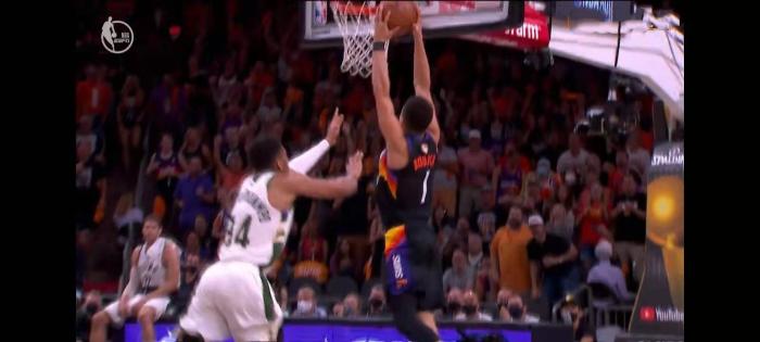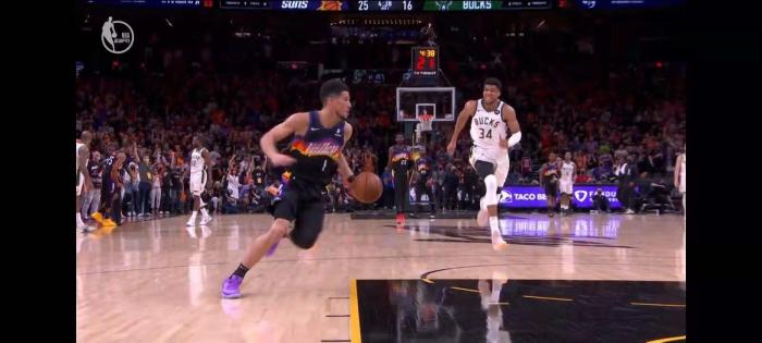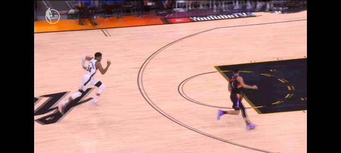 连续打进10个球,太阳队取得领先,这样的情况也让雄鹿队开始着急,比赛进行到第一节还剩下6分多钟,太阳队转换进攻,布克一马当先持球准备暴扣。当布克杀到了三分线的时候,字母哥才从半场起步追赶。