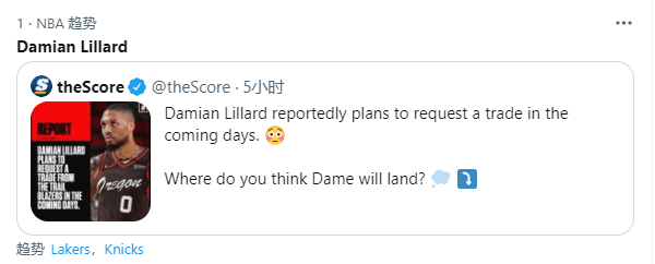 利拉德计划在未来几天申请交易的消息已经冲上推特热搜,与此同时湖人和尼克斯也引热议;对于这样的离队流言,努尔基奇怒怼记者。