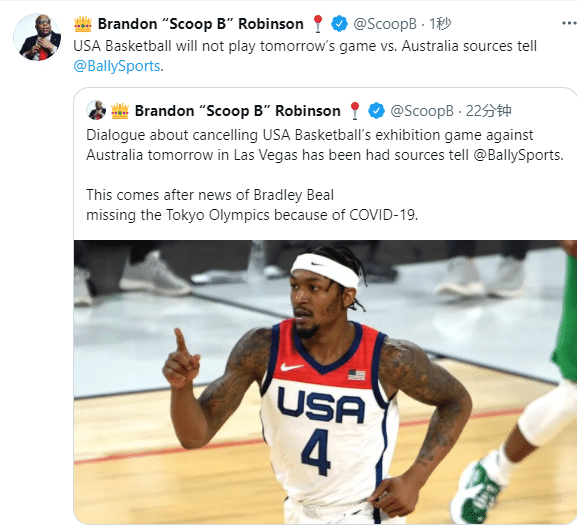 名记shams也报道美国男篮和澳大利亚的这场热身赛被取消,防疫协议导致这场比赛被取消,美国男篮将在下周一对阵西班牙。