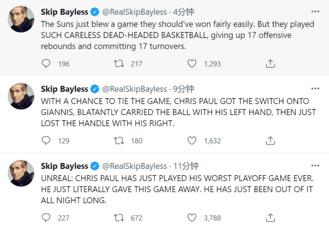 据统计,保罗在过去三场季后赛中一共出现了15次失误,是其个人自2012年以来的最多失误次数。而保罗在今年季后赛里,面对雄鹿的总决赛,是他今年场均失误最多的系列赛。
