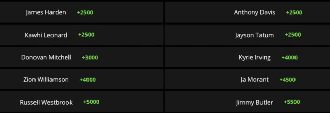 MVP赔率榜排在第11-20位的依次是哈登(+2500)、浓眉(+2500)、莱昂纳德(+2500)、塔图姆(+2500)、米切尔(+3000)、欧文(+4000)、锡安(+4000)、莫兰特(+4500)、威斯布鲁克(+5000)、巴特勒(+5500)。