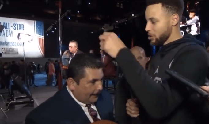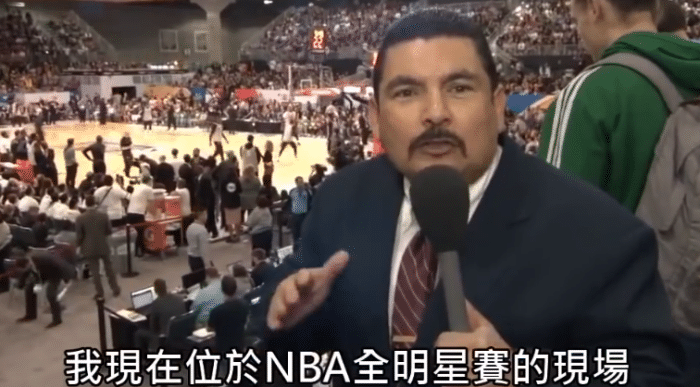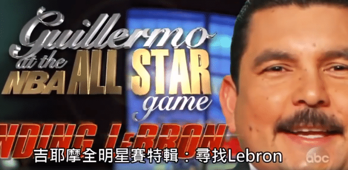 全明星期间在球员通道等待詹姆斯的到来,詹皇到来之后,Guillermo的对话又失败了。
