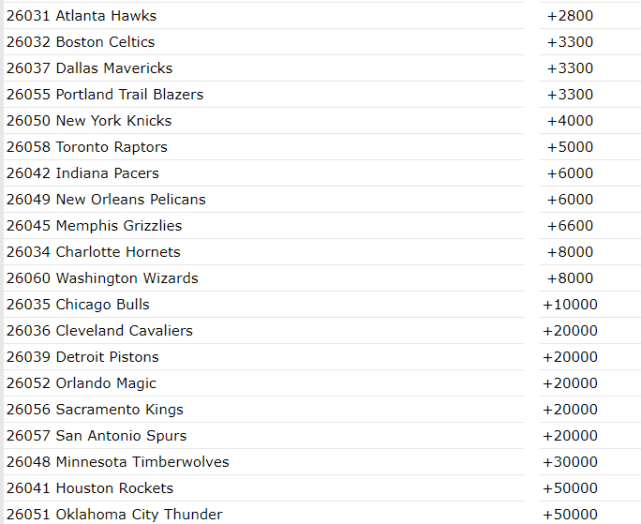 赔率榜上位居第11-20位的球队依次是老鹰(+2800)、凯尔特人(+3300)、独行侠(+3300)、开拓者(+3300)、尼克斯(+4000)、猛龙(+5000)、步行者(+6000)、鹈鹕(+6000)、灰熊(+6600)、黄蜂(+8000)。