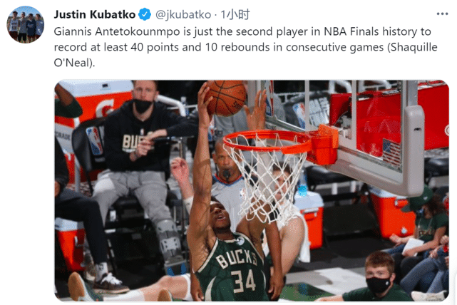 第四。字母哥连续两场至少40分10篮板,总决赛历史第二人, 比肩2000年的奥尼尔。