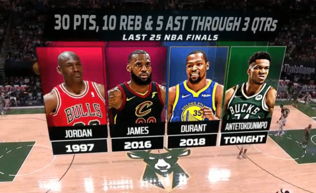 第一。字母前三节送出34分12板6助攻,是近25年第4位在总决赛三节送出30+10+5的球员,比肩乔丹、杜兰特和詹姆斯。