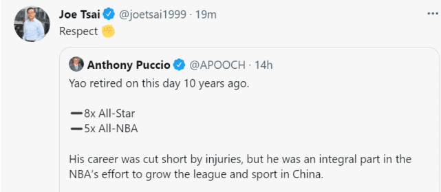篮网记者Anthony Puccio发文写道:“10年前的今天,姚明退役。他8次入选全明星,5次入选最佳阵容。他的职业生涯因伤病缩短,但他是NBA在中国发展体育事业不可或缺的一部分。”篮网老板蔡崇信转发了Puccio的推文,并配文写道:“致敬。”