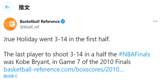 在上半场的比赛中,霍乐迪出手14次只命中3球,上一位在总决赛半场14中3的球员还得追溯到2010年抢七大战的科比。