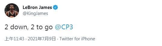 而老詹则是像上一场一样,第一时间祝贺保罗“拿下2场了,还差2胜@保罗”不得不说36岁的老炮现在距离总冠军越来越近了,因为历史上在总决赛中出现过32次0:2落后,仅4次翻盘成功,雄鹿翻盘的希望不大,稳扎稳打太阳希望很大,只是克莱格的伤情让人无奈,之后的比赛要被迫调整轮转了!
