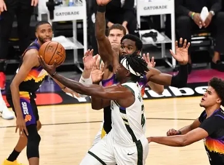 这场比赛可以说雄鹿做出了调整,他们不再用塔克去主防保罗,而是用霍勒迪,他送出了大帽并给了保罗很多的身体对抗,另外在防挡拆时对保罗和布克的限制还不错(尤其是上半场)但是在进攻端他们无法与太阳进行匹配,尽管字母哥这一场大杀四方轰下42分12板4助3帽,第三节轰下20分!