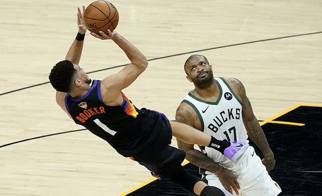塔克也有不俗的发挥,他连续得分,其中还不乏在篮下1V3摘板之后抛投打进,他的得分也一度帮助雄鹿建立9分的领先优势。甚至可以说比赛初期的塔克压制艾顿,首节的前5分钟,雄鹿在内线得分12比0,艾顿的表现还有待提升。太阳单节三分球14中8,也一直紧咬比分差距。